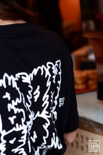 Coupe mixte, sérigraphie blanc sur noir sur le cœur et dans le dos.